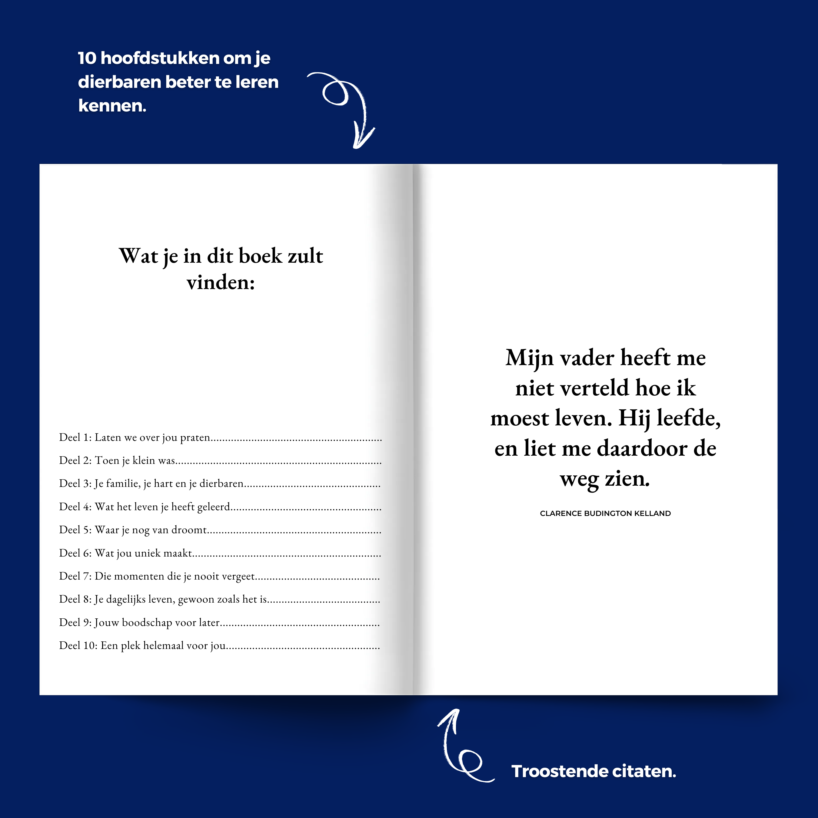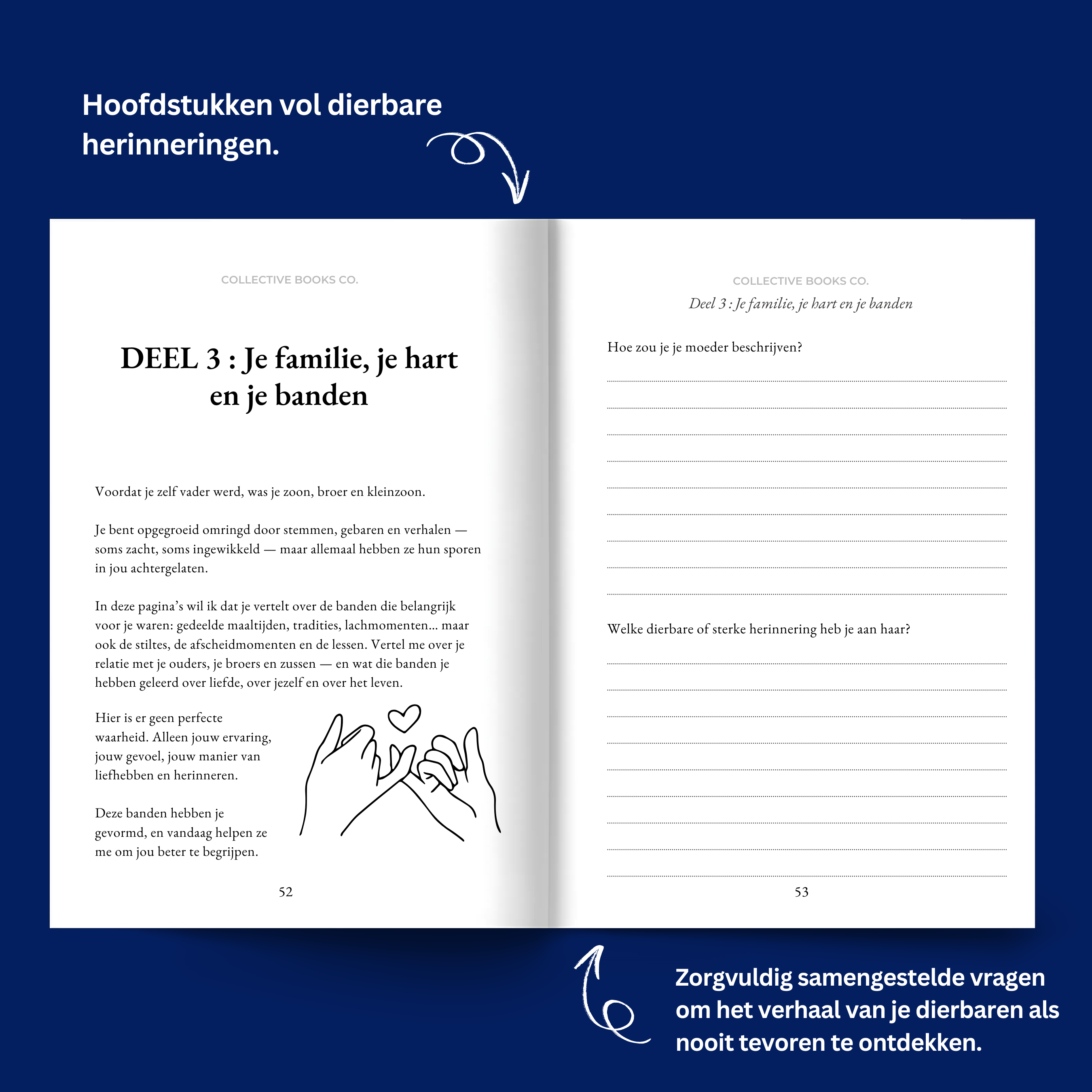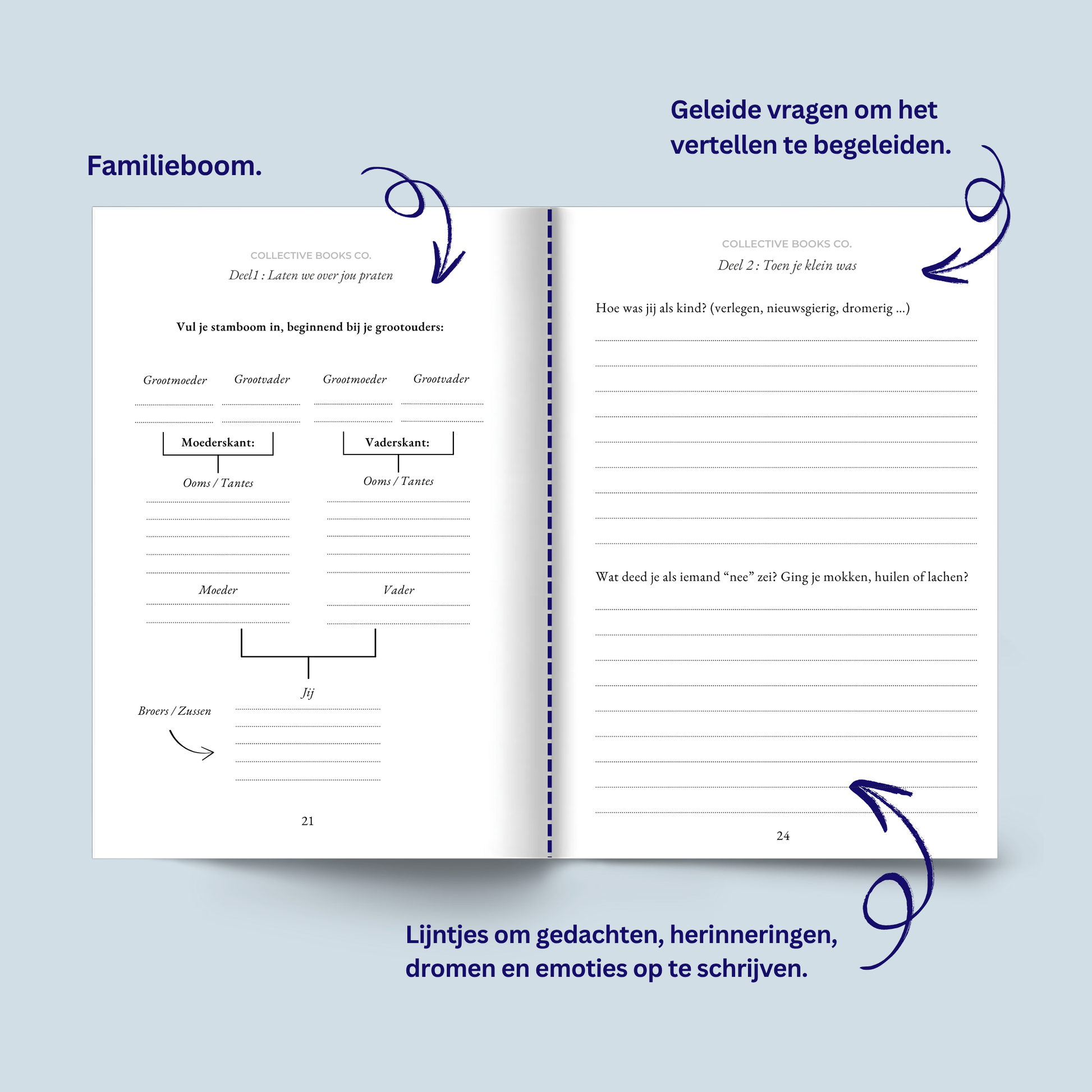 Het dagboek is volledig begeleid, met meer dan 120 zorgvuldig geselecteerde vragen die helpen om persoonlijke herinneringen, anekdotes en diepe emoties te delen. Je hoeft geen schrijver te zijn!