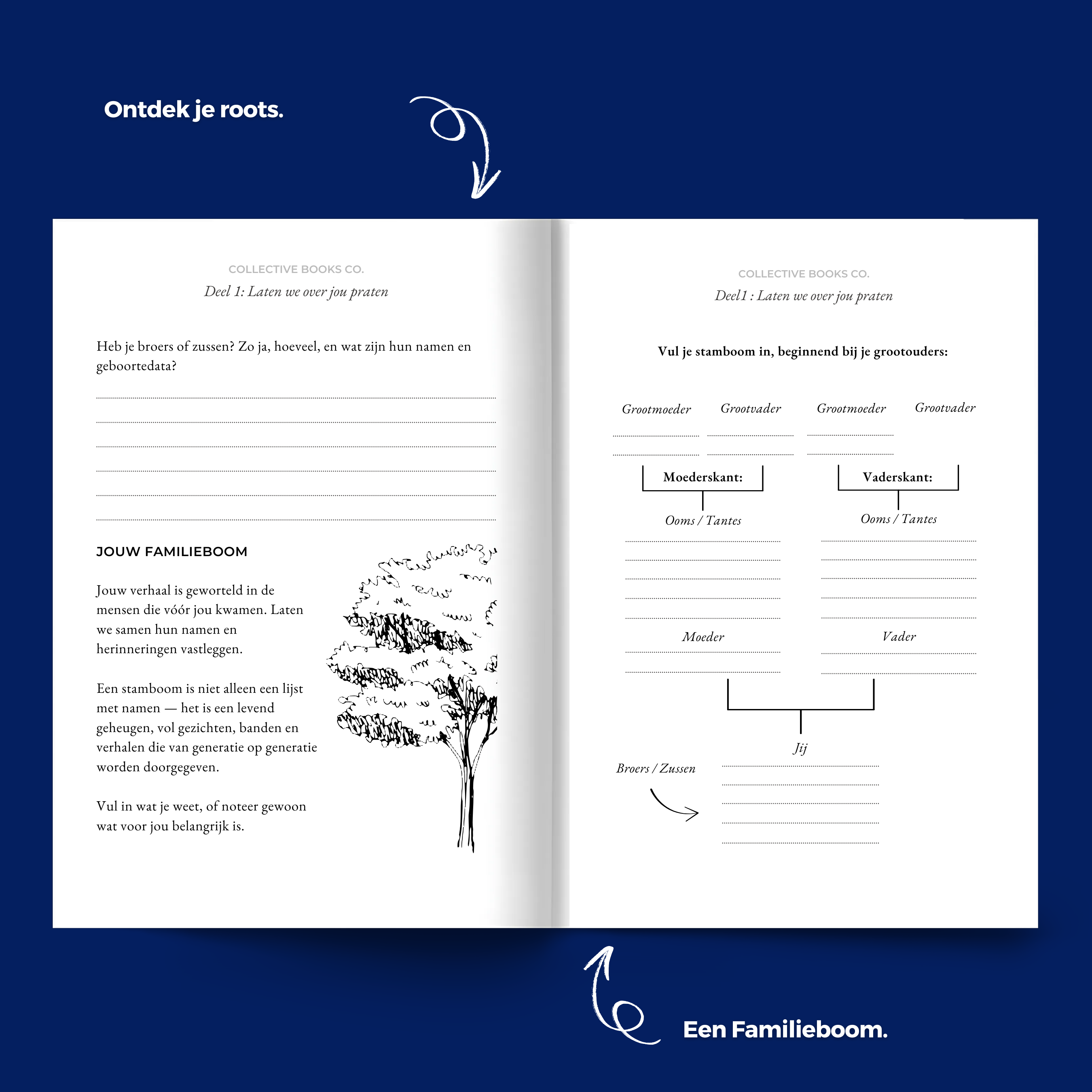 + 120 inspirerende vragen, een stamboom, vrije pagina’s en ruimte voor je mooiste foto’s.