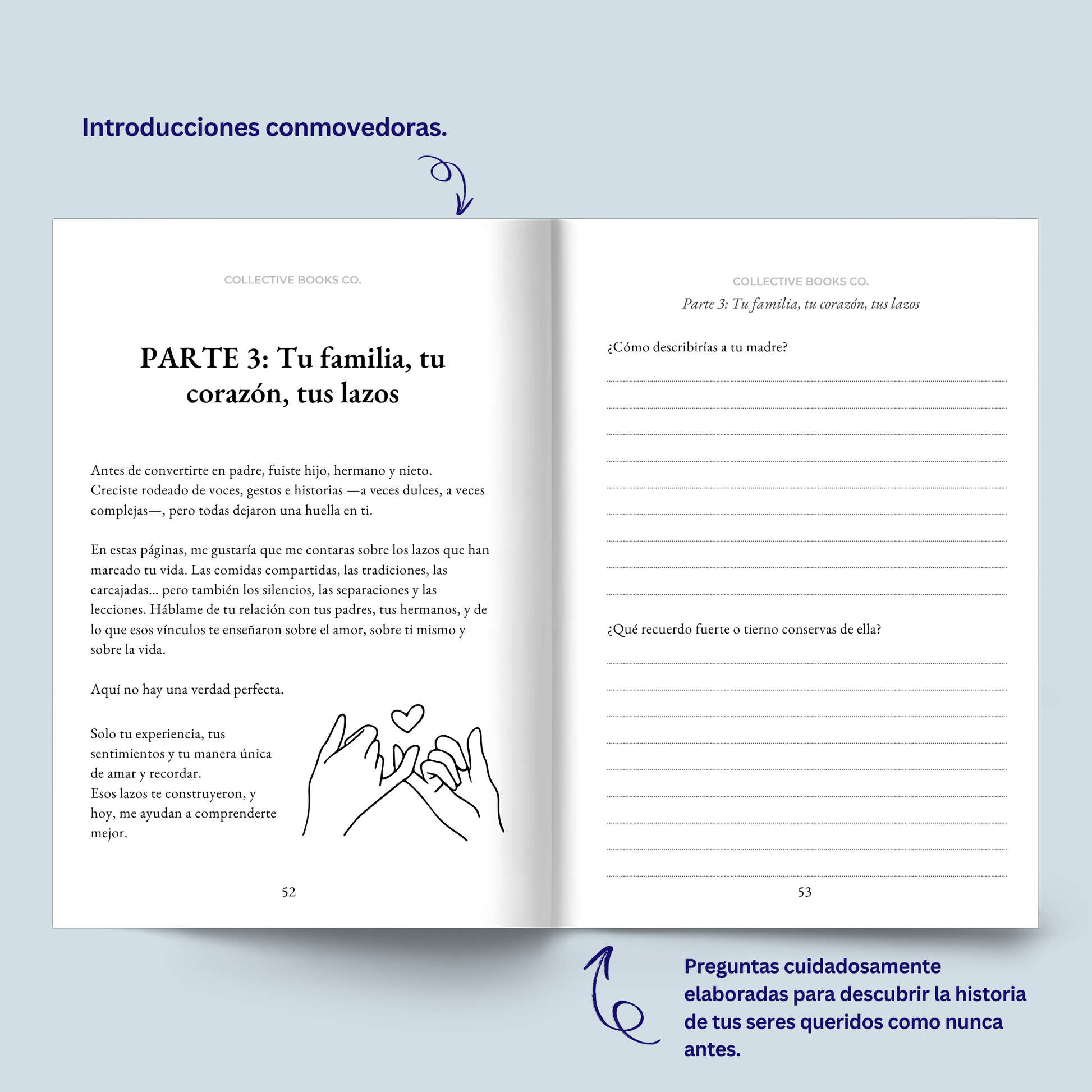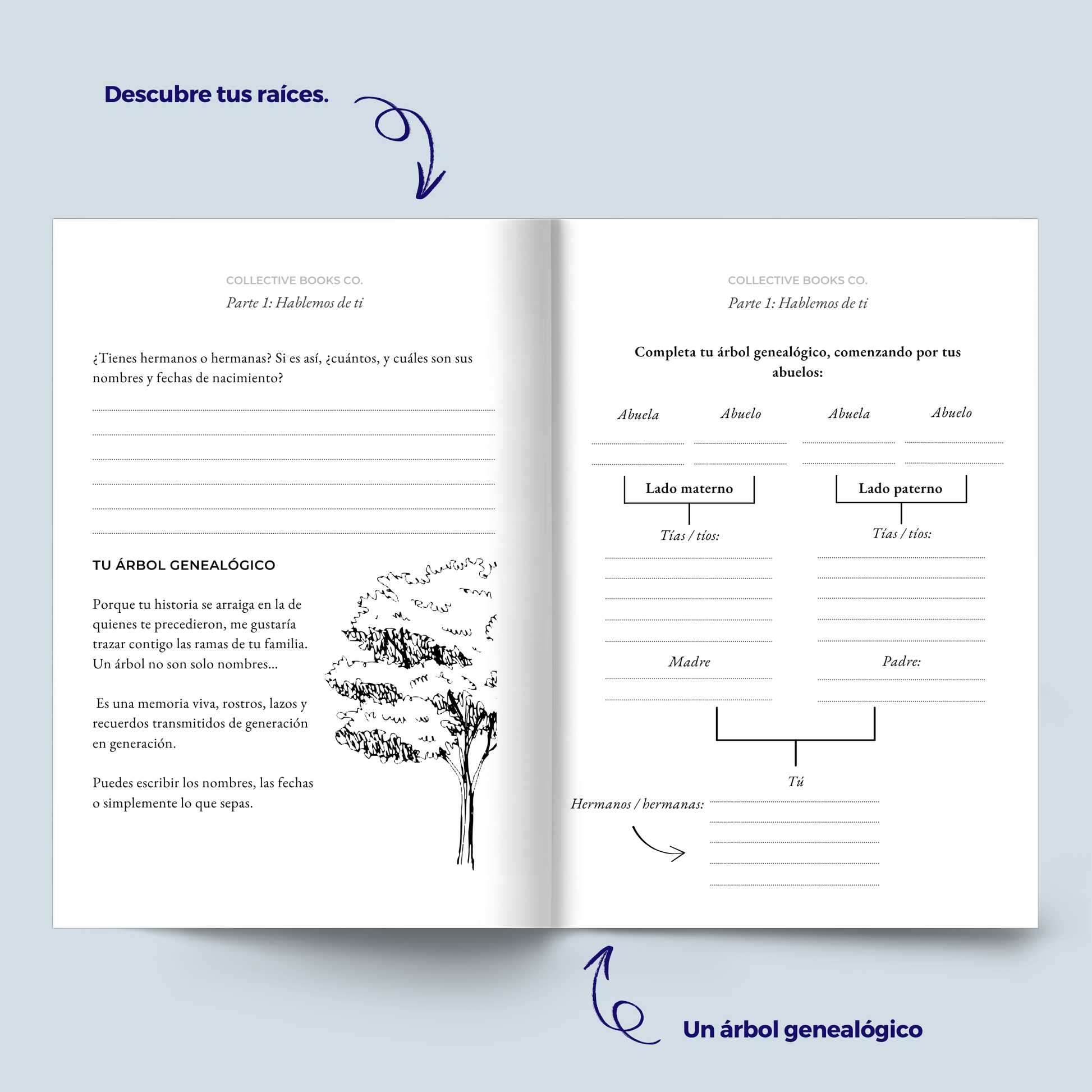 + 150 preguntas inspiradoras, un árbol genealógico, páginas en blanco y un espacio para tus fotos.