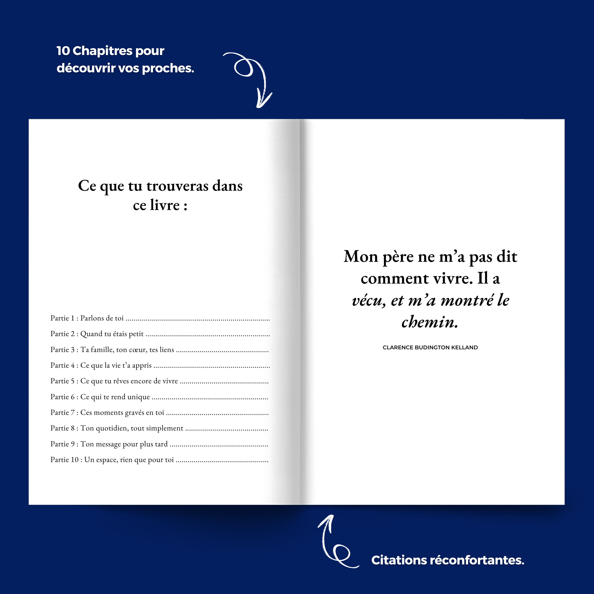 Le journal est entièrement guidé avec plus de 100 questions soigneusement sélectionnées pour aider à raconter des souvenirs personnels, des anecdotes et des émotions profondes. Pas besoin d’être écrivain !
