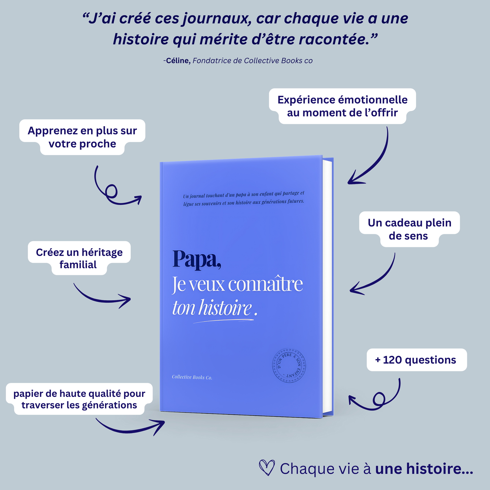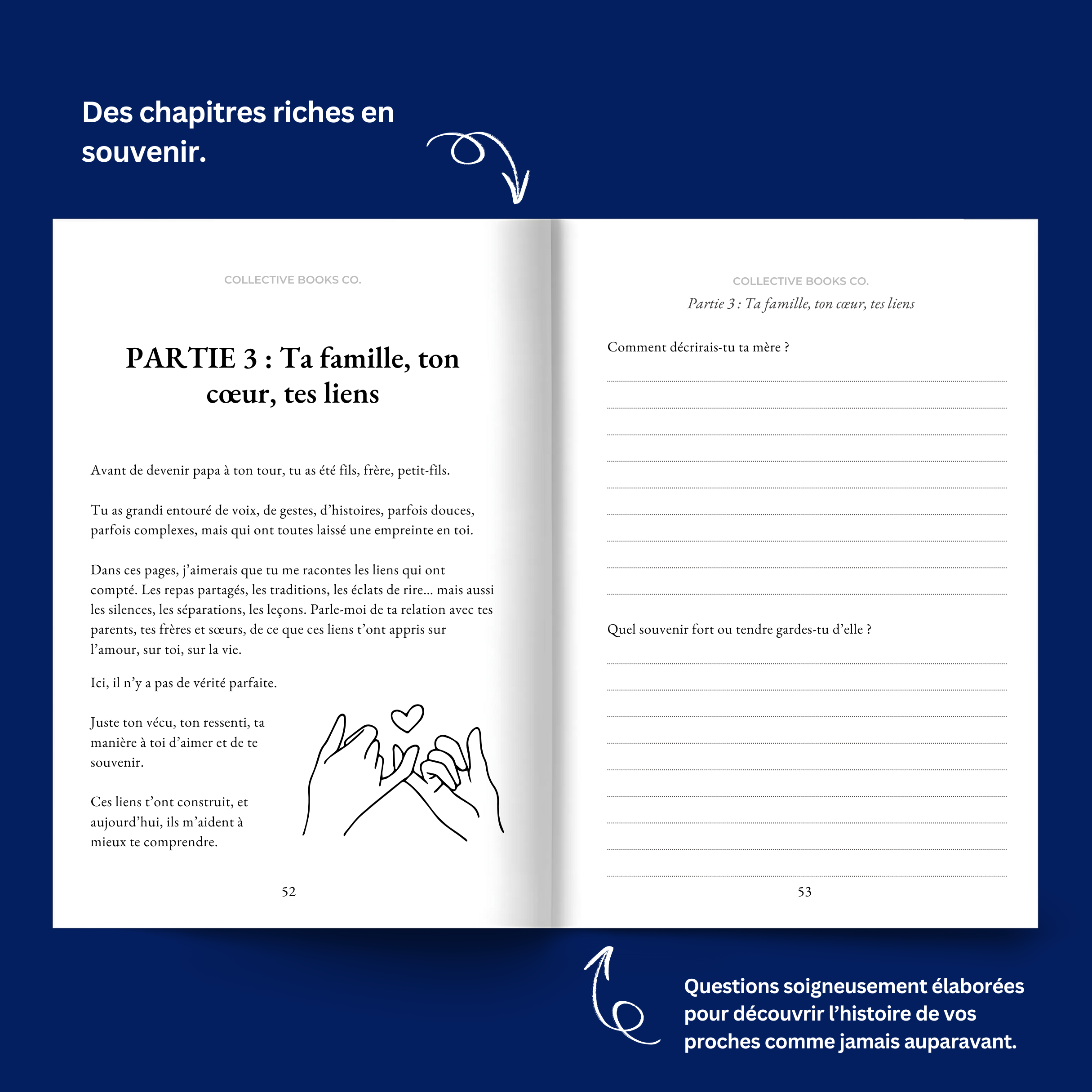 Ce journal est pensé pour tous les membres de la famille : parents, grands-parents, oncles, tantes… Toute personne dont vous souhaitez garder l’histoire précieuse. Même votre partenaire.