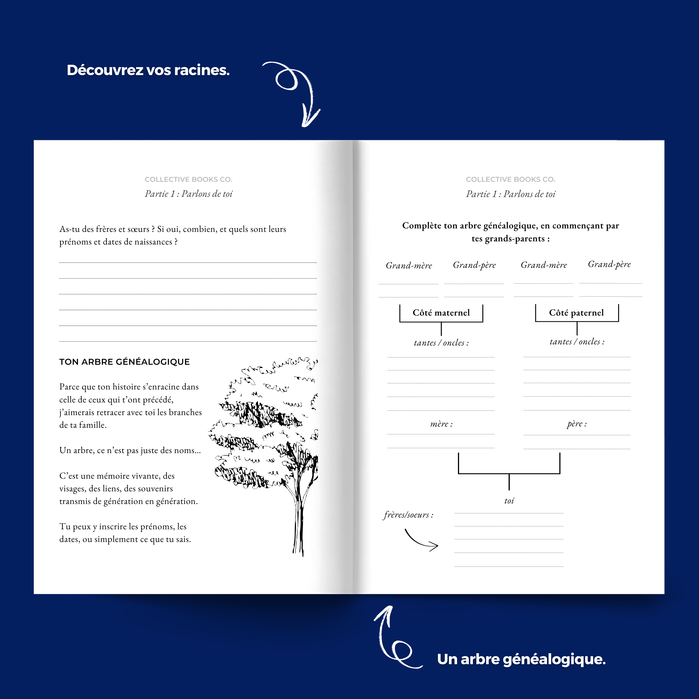 120+ questions inspirantes, un arbre généalogique, des pages libres et un emplacement pour vos photos.